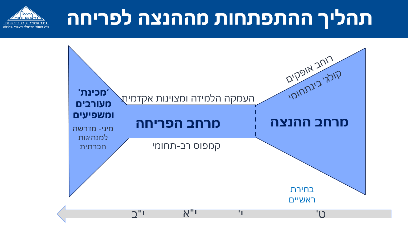 תהליך ההתפתחות של התלמידים לאורך השנים בביה"ס מגיע לשיאו במרחב הפריחה. מרחב העוסק בפריחת המיומנויות, הידע והיכולות בגישה של קמפוס פתוח המאפשר למידה דיפרנציאלית בהנעה פנימית ובוויסות עצמי, בדומה לכיוונים אליהם מתפתחת האקדמיה בשנים האחרונות.