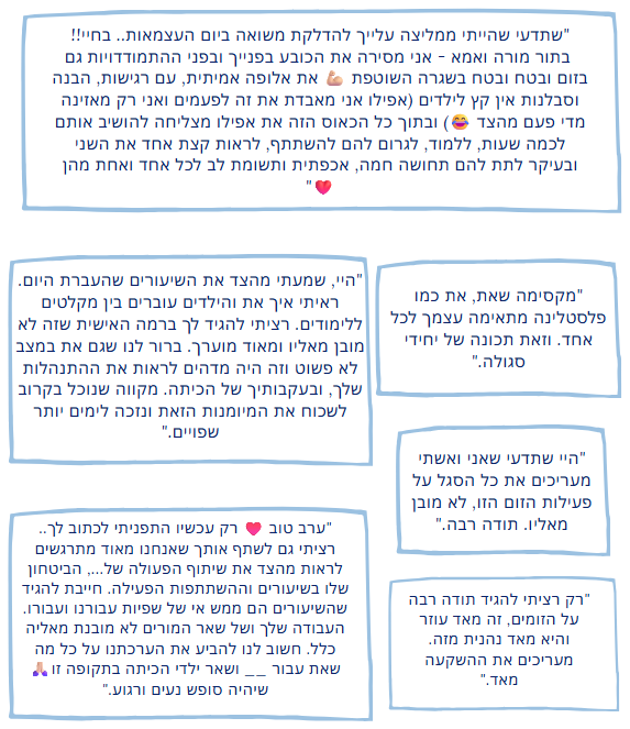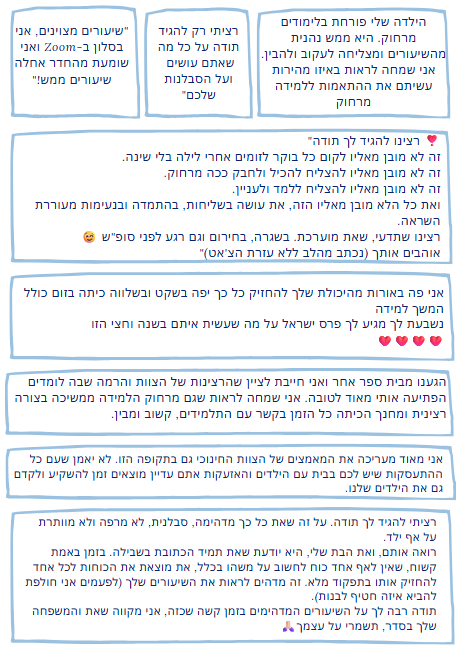 התקופה הזו מבליטה היטב את החיבור שבין הבית לבית הספר, היא מטשטשת את גבולות האחריות ומוכיחה שהחינוך הוא שותפות בין ההורים ובין צוות בית הספר, המציאות יוצרת רצף חינוכי אחד ומאחד – לא חשוב היכן באמת נמצאים הילדים.